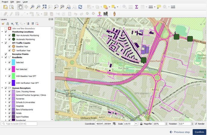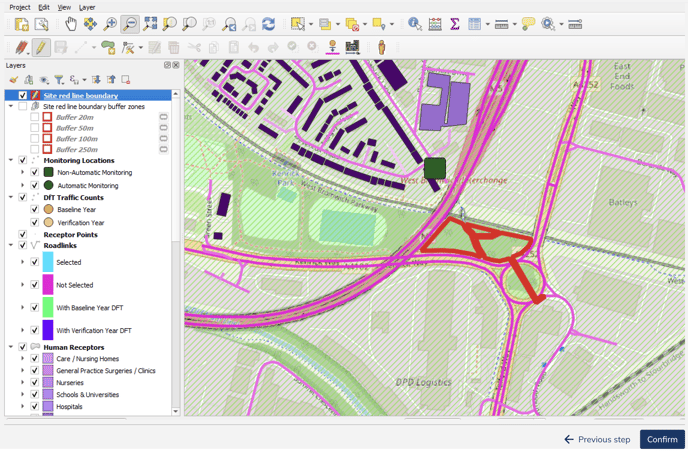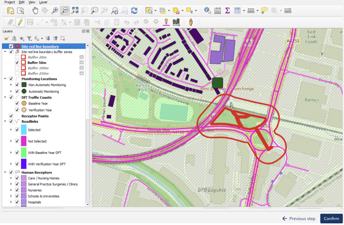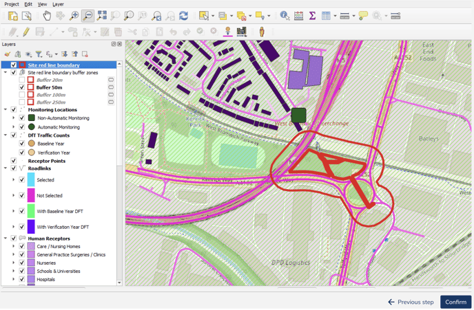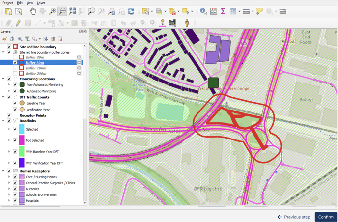 To display any buffer zone, click the checkbox near to the desired zone in the "Layers" window. For example, to display the 50-metre buffer, find the "Site red line boundary buffer zones group", and locate the "Buffer 50m" label.