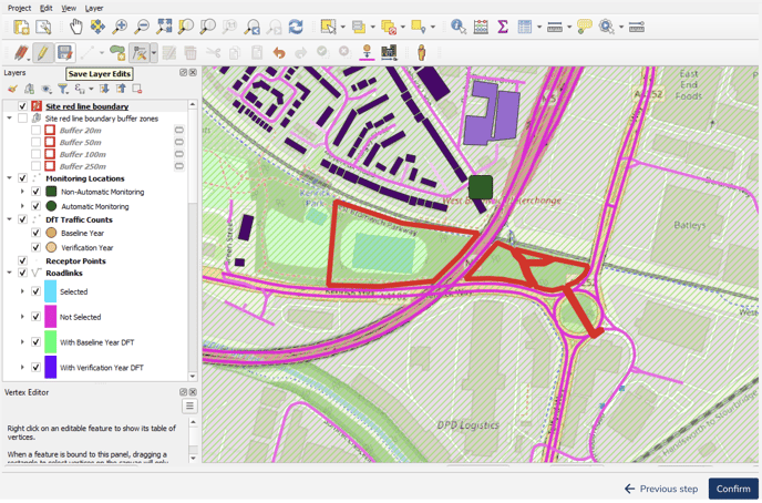 3. Make any necessary changes to the red line, such as extending a feature or adding a new one. Note that when you enter edit mode, all buffer zones will be hidden (but they will still be visible in the "Layers" panel).